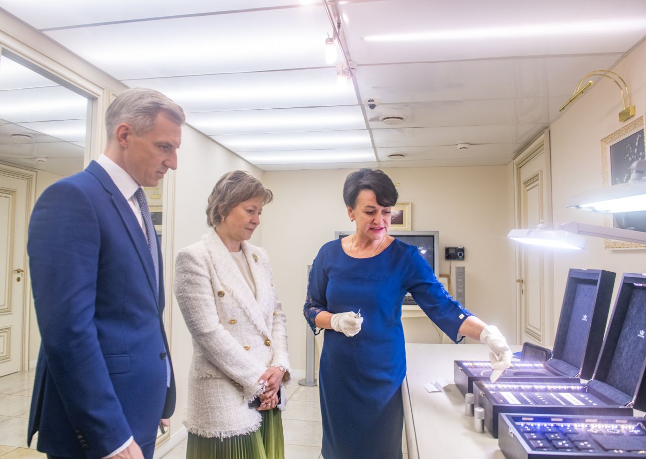 Губернатор Смоленской области Василий Анохин и генеральный директор Российского экспортного центра (РЭЦ) Вероника Никишина встретились в Смоленске с генеральным директором ограночного завода «Кристалл» Александром Захаровым и генеральным директором Ювелирной группы АЛРОСА Ириной Морозовской.