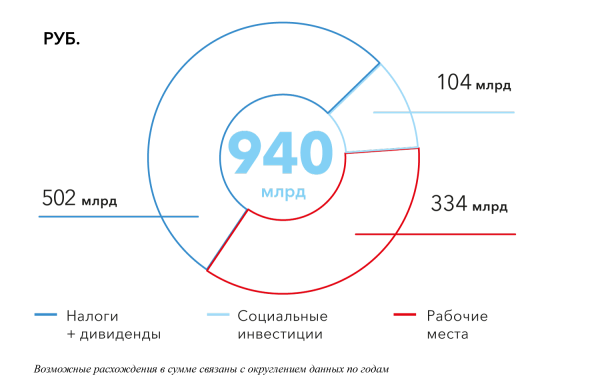 Вклад в экономику. В период с 2010 по 2020 год АЛРОСА направила около 940 млрд рублей в экономику Якутии, включая налоги и дивиденды, фонд оплаты труда и социальные инвестиции. Большую часть средств от добычи и реализации алмазов республика получает в виде налогов и дивидендов. В дополнение к прямому воздействию, раскрытому в отчете, компания также оказывает регулярную помощь местным сообществам, приобретая товары и услуги у малых и средних предприятий.