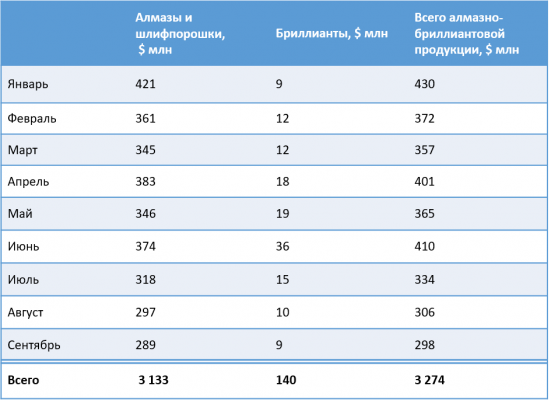 Общий объем продаж алмазно-бриллиантовой продукции АЛРОСА в сентябре составил $298 млн, в том числе алмазного сырья – $289 млн, бриллиантов − $9 млн.